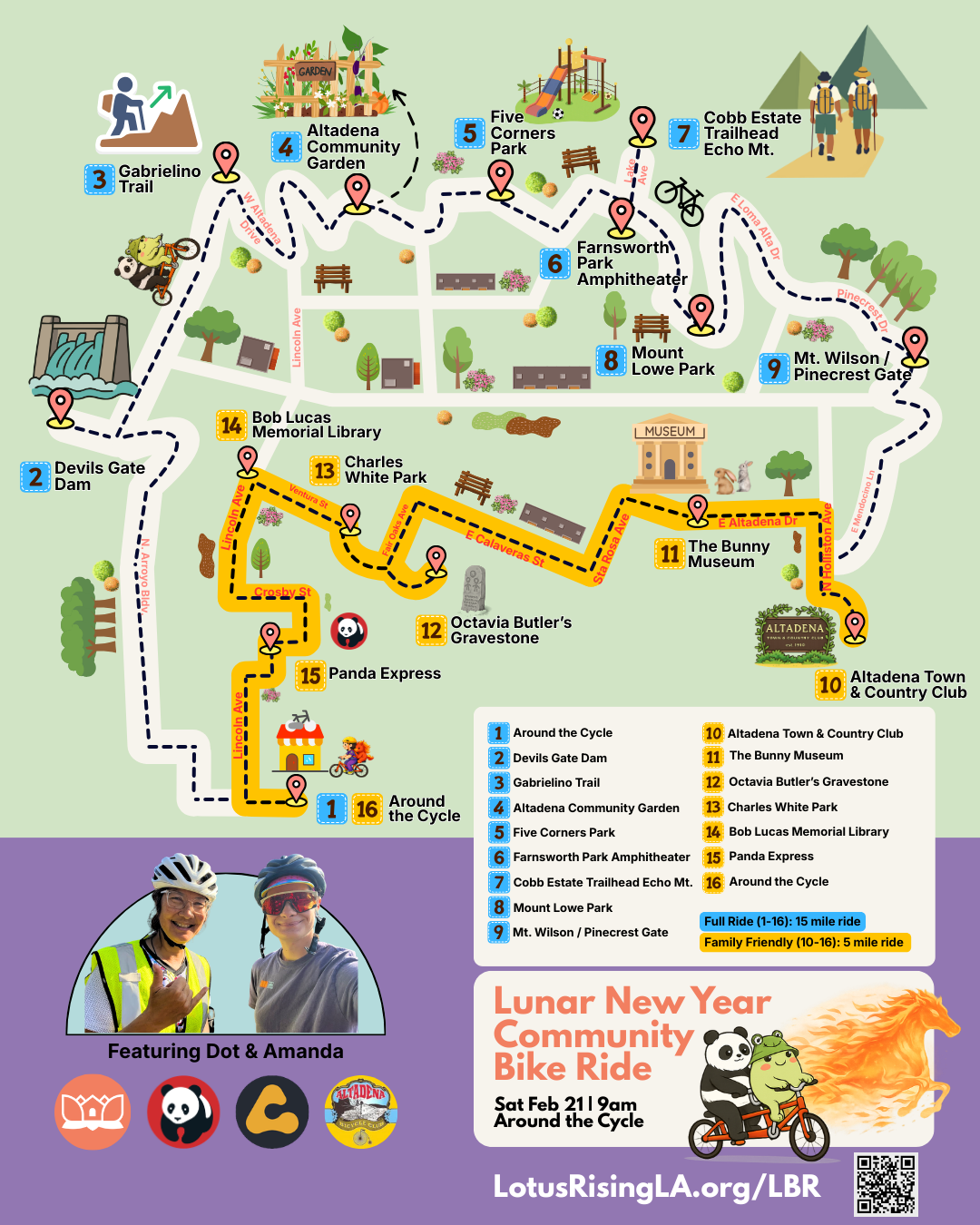 You asked! We answered! After all the excitement and positive feedback from our first Altadena Community Bike Ride, the Lotus crew, Councilmember Dorothy “Dot” Wong, and the Altadena Bicycle Club returned for our second ride. This time, we had some help from Lee, store manager at Panda Express. Fueled by the energy and momentum of the fire horse, along with some tasty mooncakes, our Lunar New Year Community Bike Ride took place on Feb. 21, 2026. Neighbors and supporters came together to ride through Altadena and Pasadena and show up for residents rebuilding after the wildfire. Read on for some of the highlights.