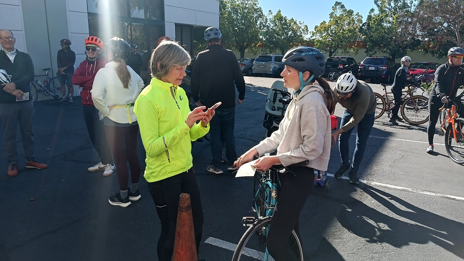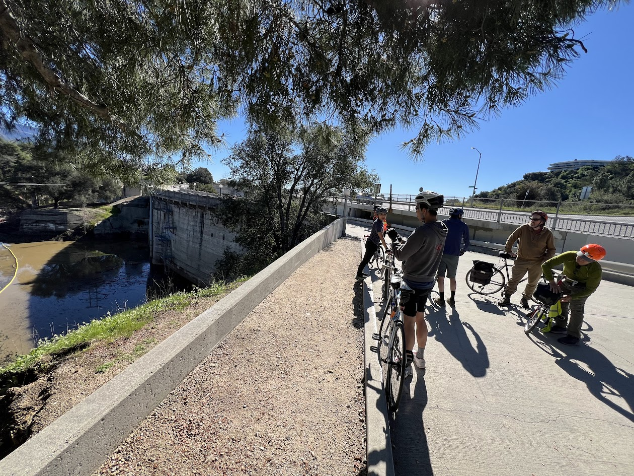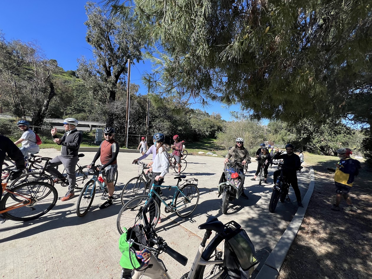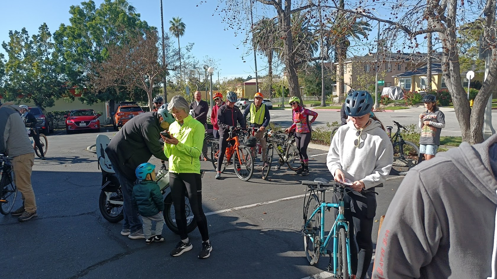 Fresh off a week of rain, the morning of the ride was chilly, but the sun was out and the sky was clear. Jeff from Around the Cycle and his wife Laura were the first to arrive and help us get ready. Lee brought the mooncakes, and her energy was infectious and unlimited. As riders started showing up, we were once again reminded of the power of community. Some came from as far as Santa Clarita. Others had joined us on our previous ride, but for many, this was their first. We counted 29 at the starting point of this 15-mile intermediate ride, and a few more were joining us later for the family-friendly portion.