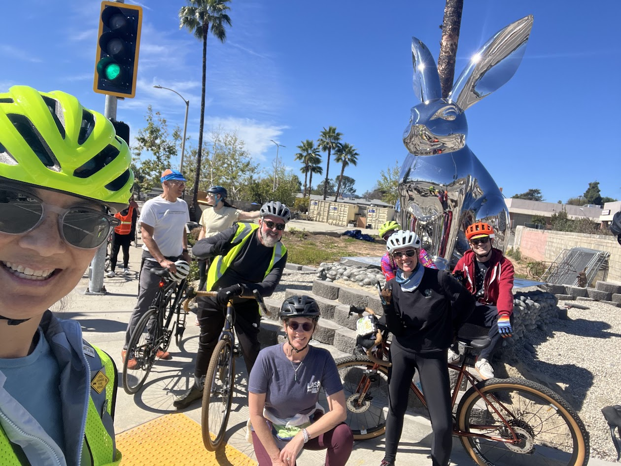 Our route took us past another local treasure, the Bunny Museum, which was destroyed in the Eaton fire. It had been the only museum dedicated to bunnies with over 46,000 documented artifacts and memorabilia. The owners plan to rebuild. We were one of the first to see the new stainless steel bunny sculpture, “Scanner,” which had been unveiled the day before and now sits on the former site. Scanner is 14 feet tall and weighs 1,100 lbs. Created by Jesse Zhao of China, the sculpture was donated to the museum by Wesley Zucco of Monrovia.